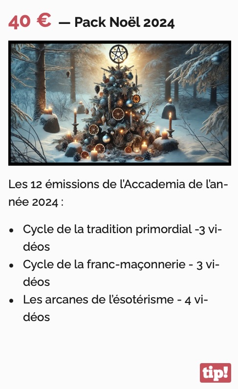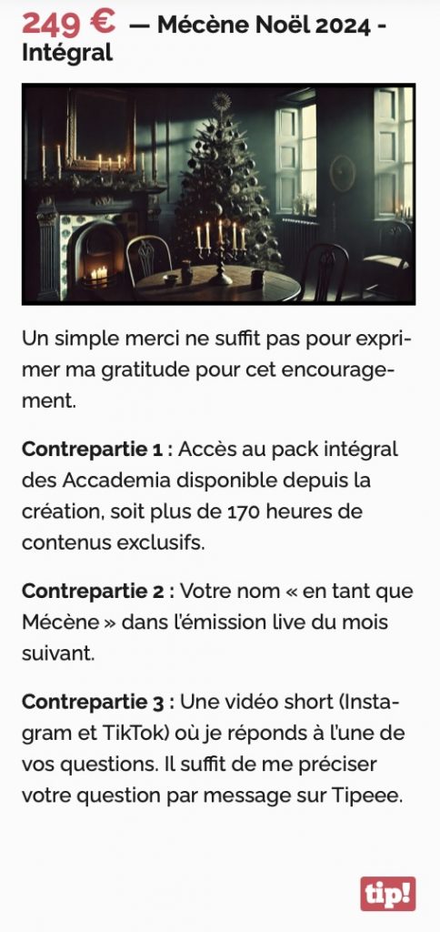 Comme chaque année, je vous propose des packs promotionnels « Via mon Tipeee » pour accéder aux vidéos privées de l’Accademia. C’est aussi une belle manière de soutenir la Web TV et la création de contenus libres et indépendants. Le premier pack comprend 12 vidéos pour « 40 euros au lieu de 60« , tandis que le second est un pack intégral proposé à « 249 euros au lieu de 349« . Offre valable jusqu’au 31 décembre à minuit.
